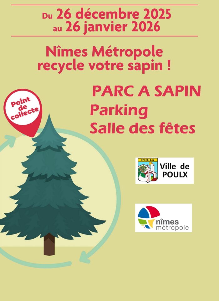 Du 26 décembre 2025 au 26 janvier 2026, Nîmes Métropole en partenariat avec la commune de Poulx, vous invitent à déposer votre sapin dans le « Parc à sapin » situé sur le parking de la salle des fêtes (côté route de Mandre)